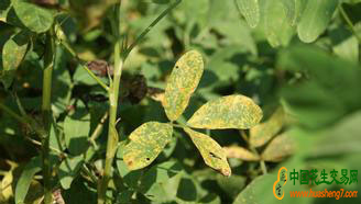 [為害癥狀]主要為害葉片,在各個生育階段都可發生,但以結莢期以后發生嚴重。葉片染病,葉背初生針尖大小的疹狀白斑,葉面呈現黃色小點,以后葉背病斑變淡黃色,圓形,隨著病斑擴大,病部突起呈黃褐色。表皮破裂后,露出鐵銹色的粉末,即病菌夏孢子堆和夏孢子。病斑周圍有一狹窄的黃暈。夏孢子堆直徑0.3~0.6mm。葉上密生夏孢子堆后,很快變黃干枯,似火燒狀。其他部位染病,夏孢子堆與葉片上的相似。重病株較矮小,提早落葉枯死,收獲時果柄易斷、落莢。