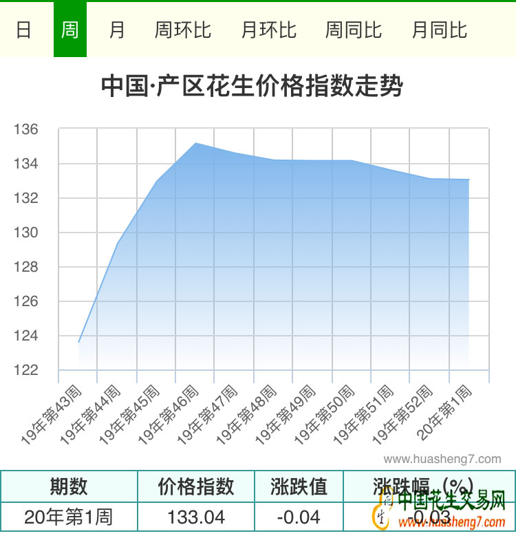 2020年第1周周定基指數為133.04,較2019年第51周下跌約-0.03%,周環比指數為99.96,較2019年第51周上漲約0.34%,周同比價格指數為126.21,較去年同期上漲約0.09%。